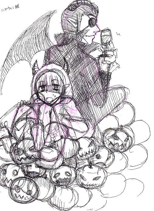 ハッピーハロウィン! はもう過ぎてしまいましたが、小旅行中にちょっと描いてました。 本当は、仮装したベルフェとサタンがベルゼブブ邸へお菓子をせがみに行くという、どうでもいい内容の漫画を描くつもりでした。ええ、断念しましたとも。 気が向いた時に描くかもしれません、季節感無視で。 この構図でイラストも描こうと思いましたが、ここまで描いて満足しました。 私はもうちょっと、形にすることを覚えた方がいい。 PR 2013/11/03 (Sun)