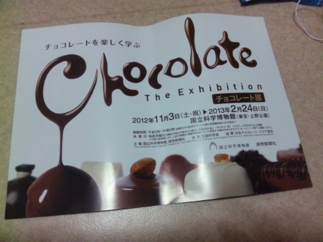 今日はオフ友2人と共に、チョコレート展へ行ってきました! チョコの歴史から製造方法など、非常に充実した内容でした。 驚いたのは、チョコレートの原材料であるカカオは、マヤ・アステカ文明の頃から重宝されていたらしく。 その時代で使用されていた器なども展示されてました。 ケツァルコアトル像(?)が異色を放ってました・・・。なぜキミがいる・・・マヤ・アステカですけど・・・。 あとチョコレートの食べすぎとニキビは関係ないそうですよ! 2012/11/25 (Sun)