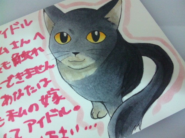 日ごろからお世話になっている、職場の先輩の猫さんがお亡くなりになりました。 去年、私が擬人化本を出した時に、描かせていただいた女の子です。 メールで連絡を頂いたときは、すごくショックでした。 私が猫アレルギーなばっかりに…一度も触れ合うことなくお別れになってしまったのです。 それを考えていたら、悲しくなってきて久しぶりに泣きました。 愛を込めて、メッセージカードを描きました。 これからもあなたは私の嫁です。お元気で。 2012/06/10 (Sun)
