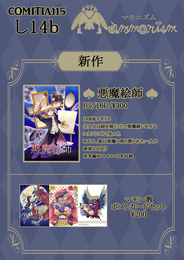 コミティア115のお知らせです! し―14b【MAMMONISM】でお待ちしてます。 ◆新刊 【悪魔絵師】 B5/16P/300円 絵を描くことで悪魔祓いをする主人公が、画家に取り憑いたグラシャ=ラボラスと戦うお話。 本編8Pと4コマ漫画が3本収録されています。 ※うち本編のみ、完売後公開予定です。 サンプルはピクシブにアップしました。 ◆お品書き ◆当日について ・お隣はnoalさんです。 ・今回もスケブはやれません…来年度の課題の準備をします…。 ・当日の天気によっては早めに撤収する可能性があります。その際にはtwitterにてアナウンスい たします。 ・また、お隣のnoalさんが開催後しばらく席を空けるそうなので、そちらの店番も引き受けています。したがって、ちょっとドタバタするかもしれませんが御了承ください。 当日は天気があまりよろしくないみたいですねブルブル 雨雪に負けずにがんばります。よろしくお願いいたします。 PR 2015/10/10 (Sat)