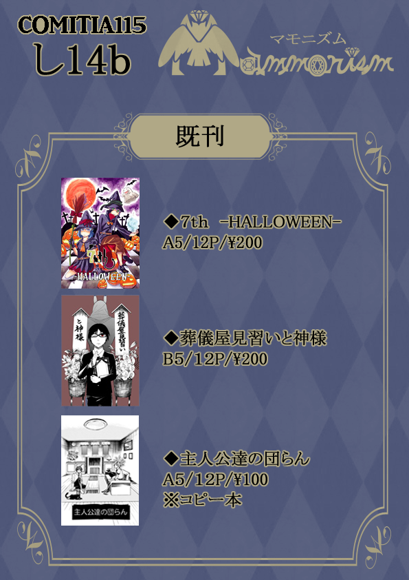 隣接で参加した相棒、このかちゃんに教わりながら描いたSDキャラ達。 授業でも描き方習ったはず・・・なんですけどね。 やっぱり友人に聞いた方がすんなりと理解できる・・・。 タイトル通り、通販を開始しています。 メニューの"Off"から見ることが可能です。一応、ここにもリンクを貼っておきます。 http://mammonism.cart.fc2.com/ 葬儀屋漫画は物語はギャグ調ですが、雰囲気はダークっぽく描けたので気に入ってます。 アヌビスを描けて本当に楽しかった! また機会があれば、彼らのお話を描きたいですね。次はトートかオシリス出したい。 そして、大変遅くなりましたが新創作「マモニズム」の設定を公開しました。 twitterの方では、色々と妄想をぶちまけてましたが・・・ようやくキャラの絵も描けた。 ちなみに、登場人物(教祖)は実際の悪魔クラスタの皆さんをモデルにしてたり。 外見・内面含め、意外に似てるところがある!と、反応もらえて楽しい。 学校の前期末審査会が終了したので、10月まではゆっくりのんびりします! |