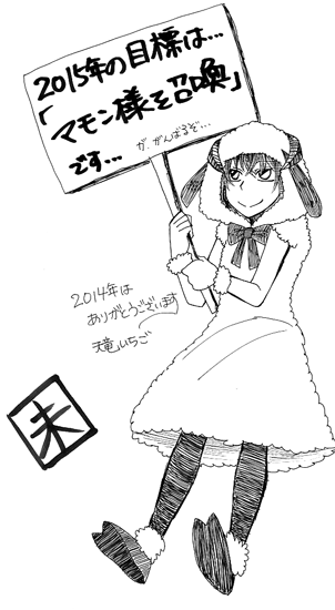 2014年はお世話になりました。 今年もまた1年、マモン教共々こちらのサイトと、私めをよろしくお願いします。 ※オンオフ共に私からの年賀状はありません。あしからず。 去年の1/1の記事を見たら、2年越しで「本編を1Pでも進める」という目標を立てておりました。結局これも叶わず終いでしたが…。 本年の目標は上記の通りです。これも叶わない可能性大ですが、本編より希望がある。 2014/12/28 (Sun)